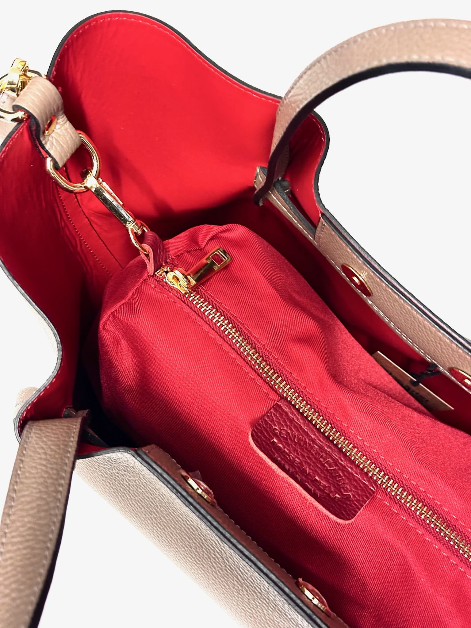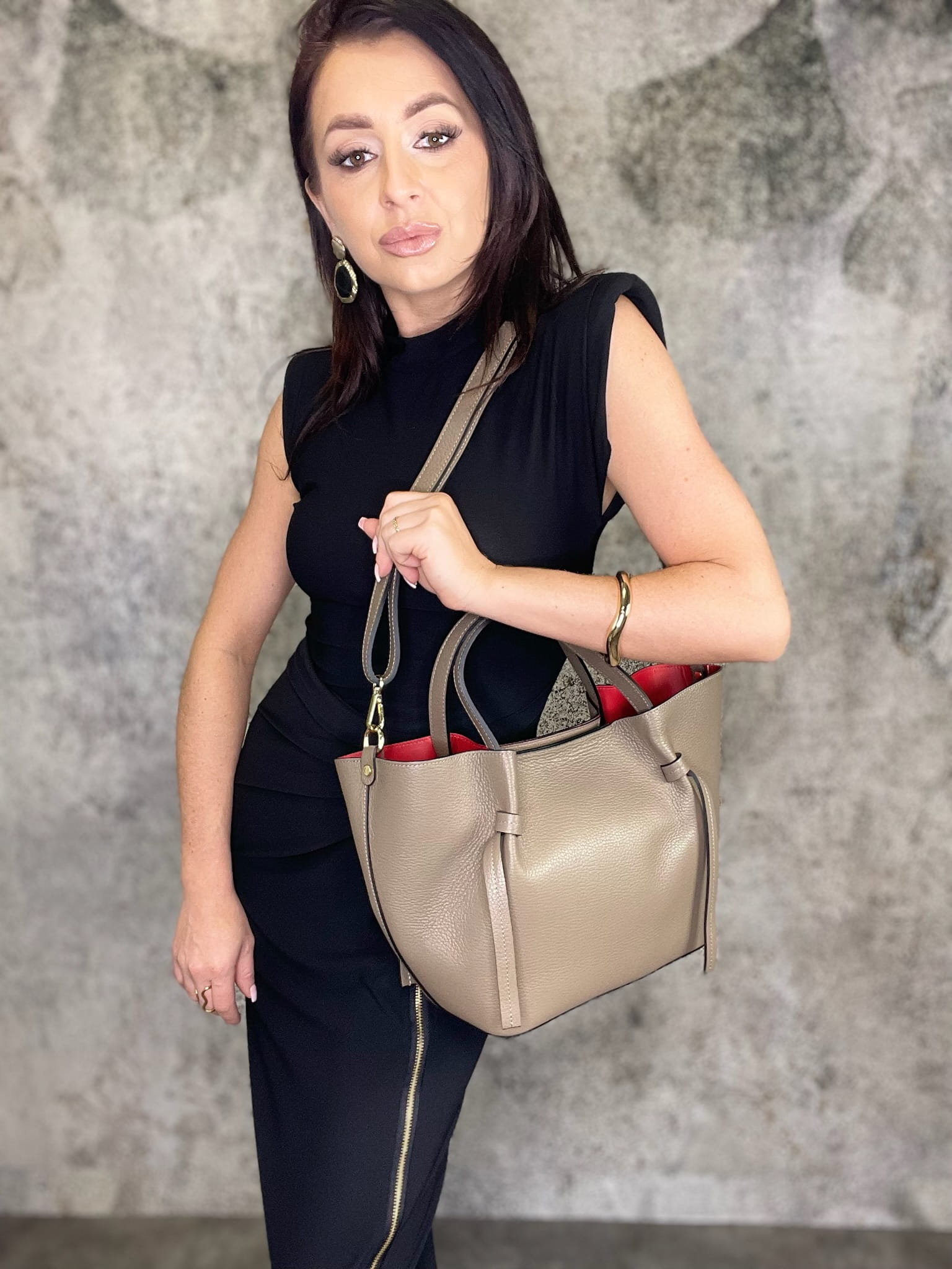 Skórzana shopperka z efektownym czerwonym wnętrzem.